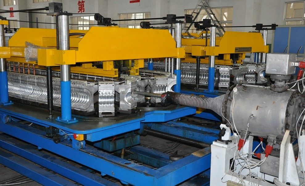 El corrugador es estructura horizontal adoptada con el tipo de cadena transmisión, equipada del sistema abierto y del vacío de la refrigeración por agua que forman el sistema. Aumenta grandemente la velocidad de la producción. El belling en la línea función disminuye coste de inversión y mejora eficacia de la producción. La mudanza del molde adopta el sistema de accionamiento motriz superior y más bajo síncrono y el sistema avanzado de la autolubricación. Asegura exactitud móvil y estabilidad acanalada de la calidad del tubo.