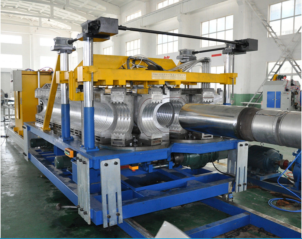 El corrugador es estructura horizontal adoptada con el tipo de cadena transmisión, equipada del sistema abierto y del vacío de la refrigeración por agua que forman el sistema. Aumenta grandemente la velocidad de la producción. El belling en la línea función disminuye coste de inversión y mejora eficacia de la producción. La mudanza del bloque del molde adopta el sistema de accionamiento motriz superior y más bajo síncrono y el sistema avanzado de la autolubricación. Asegura estabilidad móvil de la calidad de la exactitud y del tubo.