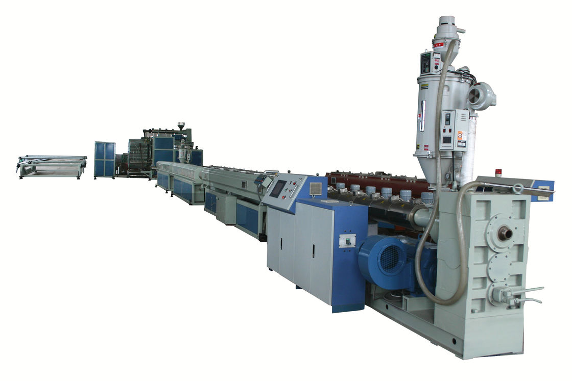 Esta línea de la protuberancia del tubo incluye el extrusor, muere cabeza, moldes, espiral que forma la máquina, formando los moldes, el extrusor del pegamento, sistema de calibración del vacío, el tanque de rociadura del agua, cortadora, volcando el soporte y la línea entera sistema que controla.