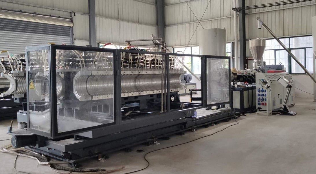 Corrugador: El corrugador es estructura horizontal adoptada con el tipo de cadena transmisión, equipada del sistema abierto de la refrigeración por agua. Aumenta grandemente la velocidad de la producción. La mudanza de los bloques del molde adopta la parte superior síncrona avanzada y baja el sistema de accionamiento motriz. Asegura exactitud móvil y estabilidad plástica de la calidad del tubo. El sistema autolubricador avanzado hace que los moldes y las abrasiones de formación de las placas del molde minimizan y amplían grandemente la vida de servicio.