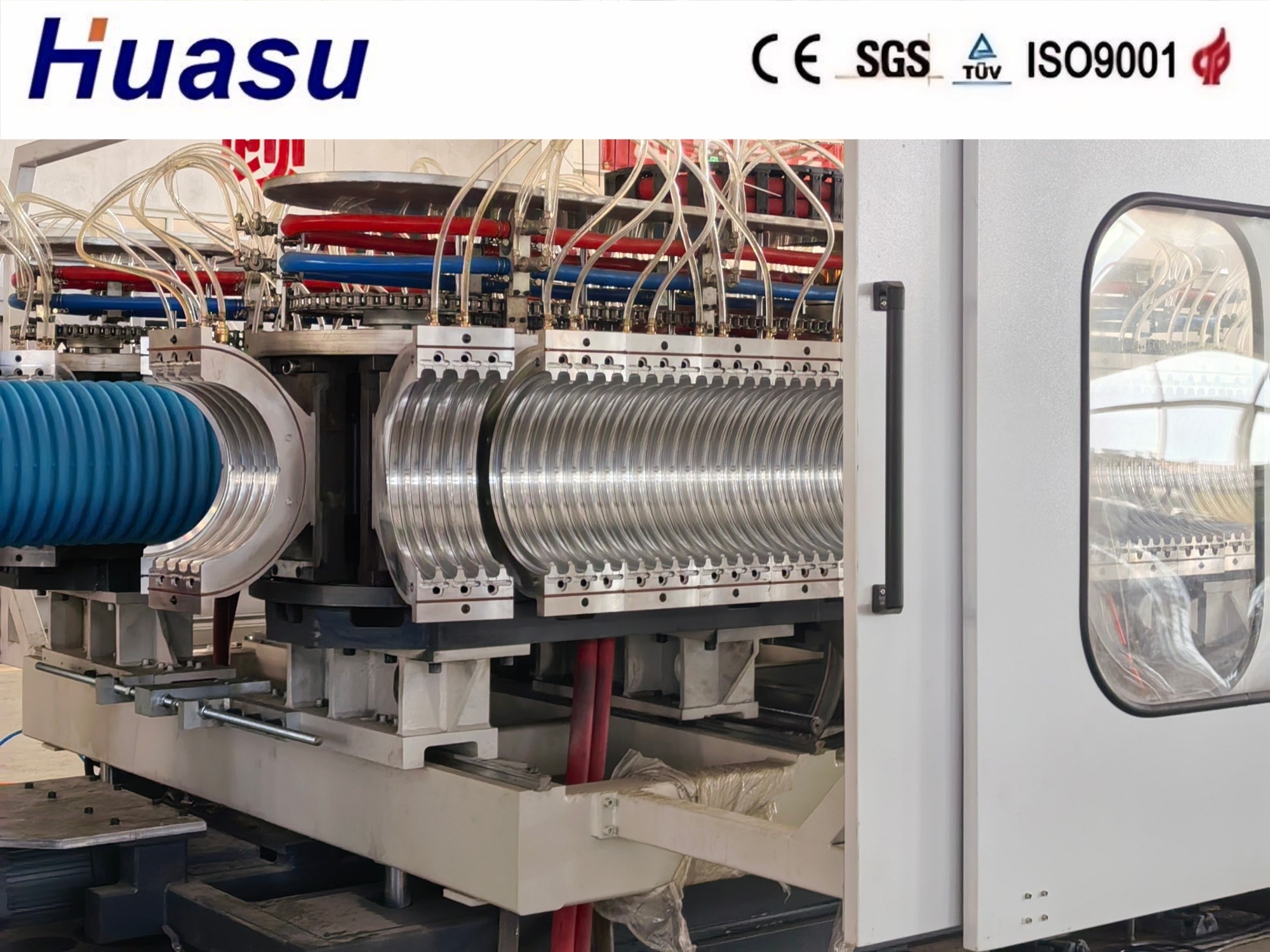 La línea de tubería de doble pared representa la tercera generación de productos mejorados de Shandong HUASU.la potencia de la extrusora y la velocidad de producción de tuberías se incrementan significativamente en un 20-40%.